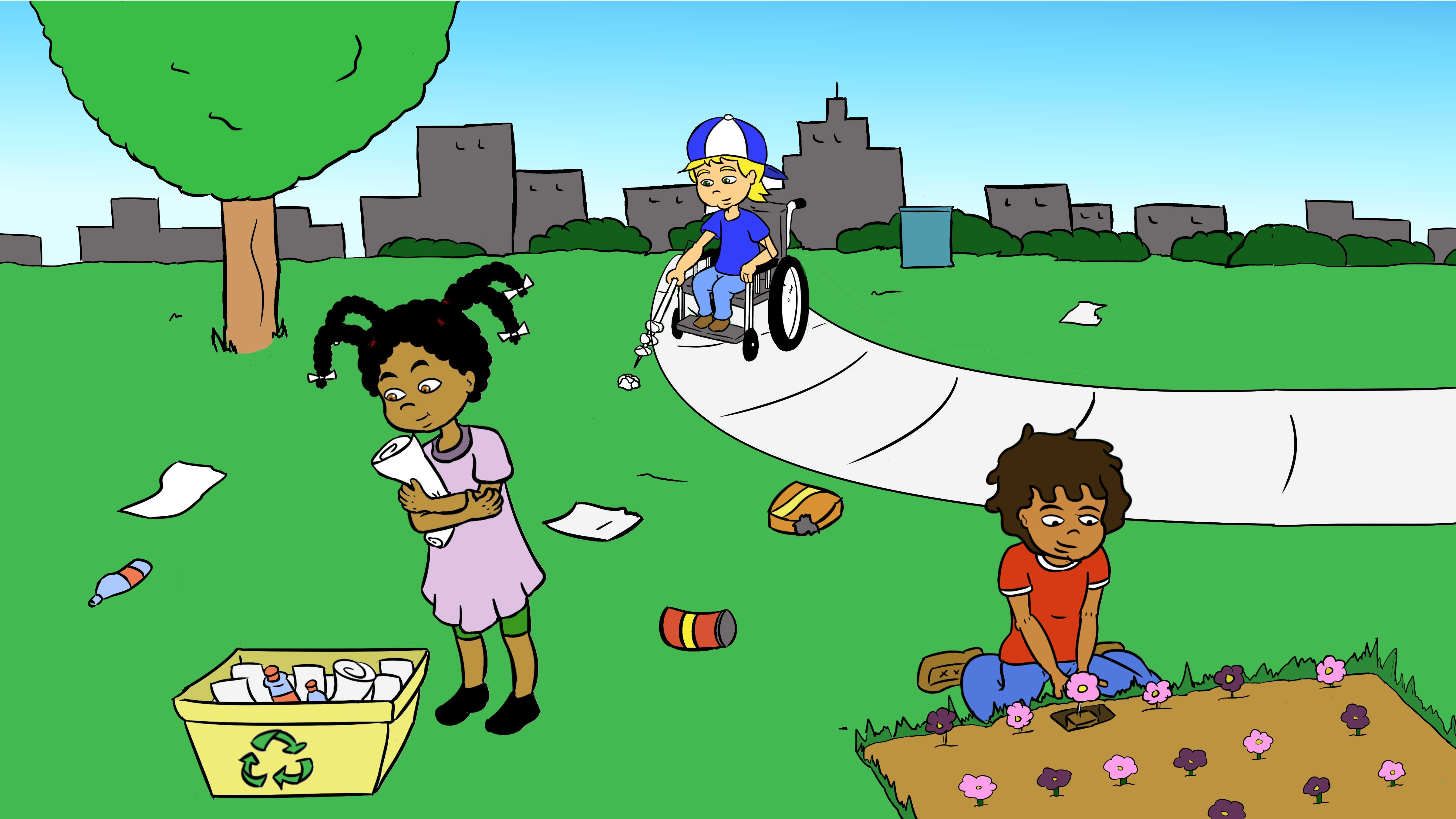 Josh is picking up trash. Erika is recycling. And Gabriel is planting a community garden.